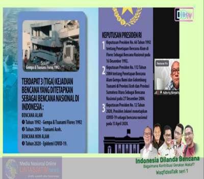 Peluang wakaf dalam kontribusi kebencanaan bisa dikatakan untuk jangka Panjang. Di era Covid-19, wakaf dapat berguna bagi masyarakat untuk ruang isolasi mandiri (isoman) dengan menerapkan protokol kesehatan, lalu kejadian bencana kita pasti butuh tempat-tempat bagi penyintas, dalam pengelolaan dengan memisahkan dari kelompok-kelompok rentan dengan tetap menjaga protokol kesehatan, banyak ide dari temen-temen CSO (Civil Society Organization) untuk mereleasisasi wakaf dalam proses siklus kebencanaan bukan hanya tanggap darurat”, ujar Raditya Jati selaku Kepala Pusat Data, Informasi dan Komunikasi Kebencanaan BNPB.