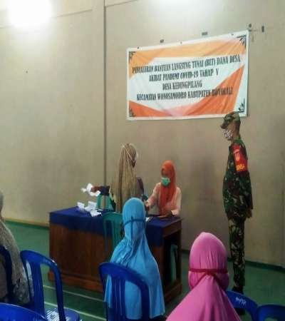 BOYOLALI (pagomex.info) – Babinsa Kedung Pilang Koramil 16/Wonosegoro Kodim0724/Boyolali , Serma Agus Widodo dan Bhabinkamtipmas Polsek Wonosegoro Aiptu Jayin dampingi masyarakat saat menerima Bantuan Langsung Tunai (BLT) Dana Desa di Balai Desa Kedung Pilang , Kecamatan Wonosegoro, Kabupaten Boyolali. Selasa (25/05/2021).