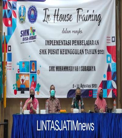 SURABAYA (lintasjatimnews) – Dalam Rangka mewujudkan kurikulum pendidikan yang memerdekkan SMK Pusat Keunggulan, SMK Muhammadiyah 1 Surabaya melakukan In House Training IHT kurikulum bagi Guru selama 10 hari baik secara luring dan secara Daring, yang di buka pada hari kamis ( 5/08/2021 ) di Aula SMK Muhammadiyah 1 Surabaya Jl Kapasan 73 – 75 Surabaya.
