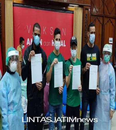 SURABAYA (lintasjatimnews) – Akhirnya tuntas sudah penantian empat pemain asing Persebaya untuk mendapatkan vaksin sebagai persyaratan untuk tampil di kompetisi Liga 1.Bertempat di kantor pemerintah provinsi Jawa timur,seluruh legiun asing persebaya telah disuntik dosis vaksin pertama pagi tadi (18/08/2021).Rupanya ada alasan mengapa kegiatan vaksinasi dilaksanakan di sana.