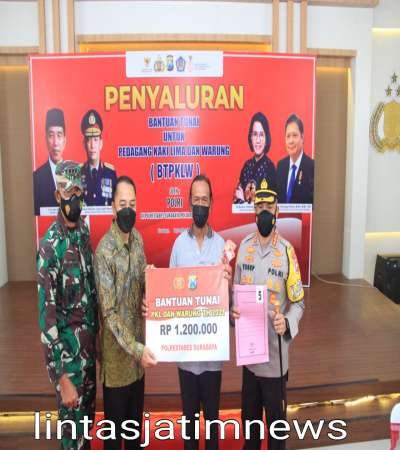 SURABAYA (lintasjatimnews ) – Kapolrestabes Surabaya, Kombes Pol A. Yusep Gunawan, S.H., S.I.K., M.H., M.Han bersama Walikota Surabaya, Eri Chayadi memantau langsung penyaluran bantuan tunai untuk untuk Pedagang Kaki Lima dan Warung (BTPKLW) di Gedung Pesat Gatra, Polrestabes Surabaya, Jum’at (24/09/2021).