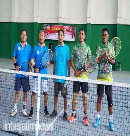 NGANJUK Pagomex – Danrem 081/DSJ, Kolonel Inf Waris Ari Nugroho bersama anggotanya melakukan pertandingan persahabatan tenis lapangan dengan para guru SMAN 1 Nganjuk di GOR Bung Karno, Begadung, Nganjuk, Sabtu (15/1/2022) pagi.