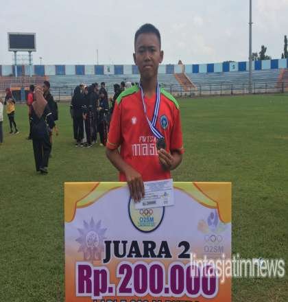 LAMONGAN Pagomex – Setelah menerima penghargaan berjuang dalam Olimpiade Olahraga Siswa Muhammadiyah (O2SM) 2021 Putra Fajar Prasetyo dari atlit lari dengan nomor 500 meter yang digelar di Stadion Surajaya Lamongan, Kamis (27/01/2022).