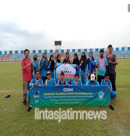 LAMONGAN Pagomex – Atlet SMP Muhammadiyah 26 Babat Hannik Shofia sukses meraih medali emas nomor tolak peluru putri cabang olahraga atletik tingkat SMP Olimpiade Olahraga Siswa Muhammadiyah (O2SM) 2021 yang digelar di Stadiun Surajaya Lamongan, Stadion Surajaya Lamongan, Selasa (25/1/2022).