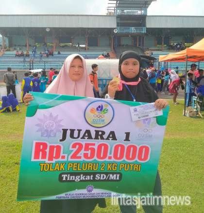 LAMONGAN Pagomex – MIM 16 Karangsem Paciran meraih emas Cabor (Cabang olah raga) tolak peluru pada O2SM tahun 2021 yang diselenggarakan di stadion Surajaya Lamongan, Kamis (27/1/2022)