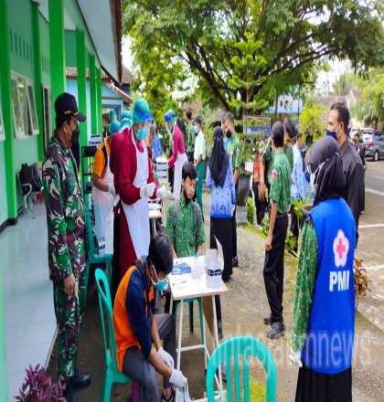 TULUNGAGUNG Pagomex – Pelda Bintoro dan Serda Yosi anggota Koramil Tipe B 0807/15 Pagerwojo mendampingi tim tenaga kesehatan dari Puskesmas Pagerwojo melaksanakan kegiatan pelacakan dan uji random Covid-19 terhadap para guru dan siswa-siswi SMKN 1 Pagerwojo Kecamatan Pagerwojo Kabupaten Tulungagung Jawa Timur, Kamis (17/02/2022).