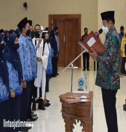LAMONGAN Pagomex – Sebanyak 381 jabatan fungsional guru hasil seleksi ASN tahun 2018, 3 penilik yang pindah jabatan dari guru, dan 1 penilik yang naik jenjang dari madya ke utama resmi dilantik secara langsung oleh Bupati Lamongan Yuhronur Efendi di ruang pertemuan Gajah Mada Sekretariat Daerah Kabupaten Lamongan, Jum’at (25/2/2022)