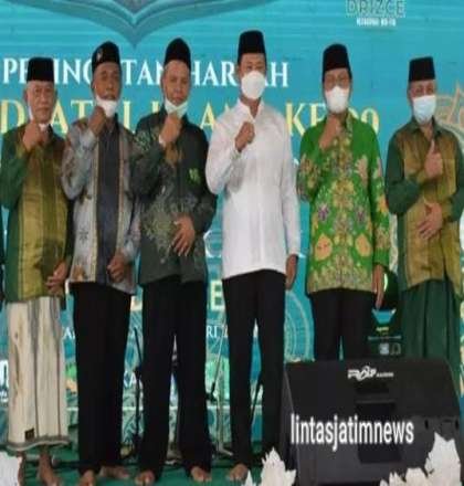 LAMONGAN Pagomex – Bupati Lamongan Yuhronur Efendi menghadiri Peringatan Hari Lahir (Harlah) Nahdlatul Ulama Ke-99 Hijriyah sekaligus Harlah Pabrik Air Mineral Dalam Kemasan (AMDK) NU Drizce Ke-1 di Kompleks Pabrik NU Drizce Dusun Betiring Desa Sumberagung Kecamatan Brondong, Ahad (27/2/2022).