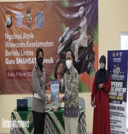 GRESIK Pagomex – Satlantas Polres Gresik memberikan materi pendidikan lalu lintas dalam rangka operasi Keselamatan Semeru 2022. Materi ini diberikan kepada para guru SMA Muhammadiyah 1 Gresik, Rabu (09/03/22).