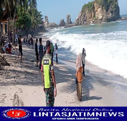 PACITAN Pagomex – Babinsa Koramil 0801/11 Donorojo Kodim 0801/Pacitan Serda Siswanto bersama Bhabinkamtibmas Polsek Donorojo dihari libur melaksanakan patroli pendisiplinan protokol kesehatan terhadap warga dan pengunjung di pantai klayar Desa Sendang Kec. Donorojo Kab. Pacitan. Minggu (15/05/2022).