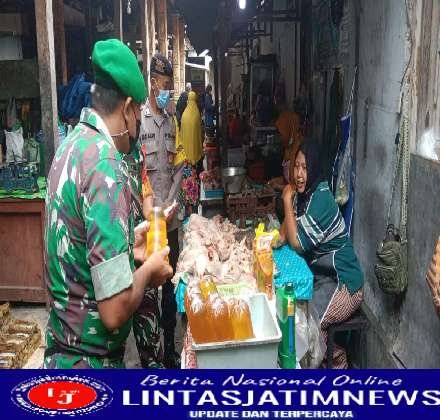 Pada kesempatan ini Sertu Suprapto mengecek ketersediaan minyak goreng curah maupun minyak goreng kemasan di kios-kios yang ada di pasar Pojok