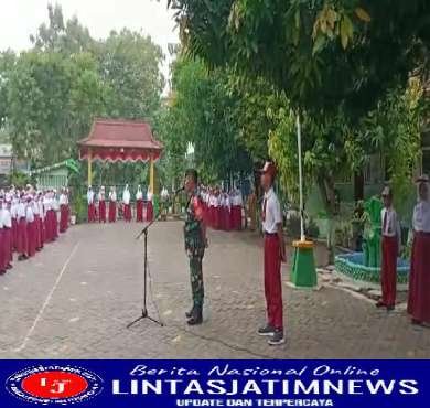 NGAWI Pagomex – Babinsa Koramil 0805/02 Paron Pelda Sunyoto memberikan materi wawasan kebangsaan tentang kedisiplinan dan ideologi negara kepada siswa-siswi SDN-1 Jambangan, Kecamatan Paron, Kabupaten Ngawi, Selasa (11/10/2022).