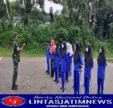 SLEMAN Pagomex – Bati Tuud Koramil 06/Ngaglik Kodim 0732/Sleman Peltu Marjono bersama satu Babinsanya melaksanakan pelatihan Baris-berbaris (PBB) dan memberikan Wawasan Kebangsaan kepada pelajar SMP IT AL Azhar Kairo yang berada di Dusun Ngangkruk Candirejo Sardonoharjo Ngaglik Sleman.21/11/2022