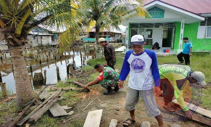 MENTAWAI Pagomex.com – Babinsa Koramil 01 Sikabaluan Kodim 0319/Mentawai Serka Aditya Bersama Warga Perbaiki jembatan penyebrangan ke kantor KUA Siberut Utara Kab Kep Mentawai. 19/Januari/2023