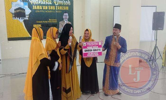 pengundian hadiah umroh gratis dari PT berkah ZAM ZAM wisata di menangkan oleh ibu komsiah berusia 70 tahun dari Bawean Gresik