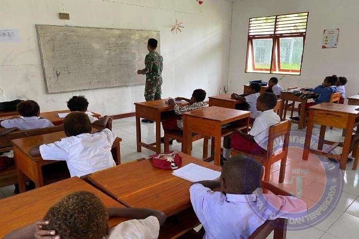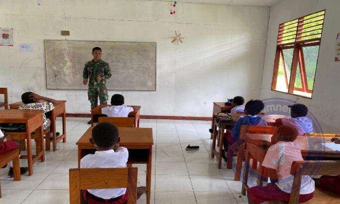 KEEROM Pagomex.com – Guna mencerdaskan generasi penerus bangsa, Pos Mosso Satgas Pamtas RI-PNG Yonif 132/BS melaksanakan kegiatan mengajar di SD Mosso, Distrik Muara Tami Kabupaten Keerom, Kamis (09/02/2022).