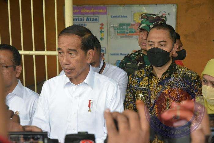 SURABAYA Pagomex.com – Wali Kota Surabaya Eri Cahyadi menerima kunjungan Presiden RI Joko Widodo di pasar tradisional Wonokromo, Sabtu (18/2/2023).