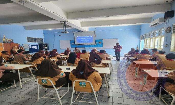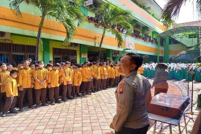 Dihadapan siswa dan siswi SMPN 3 Waru Sidoarjo, anggota Ditbinmas Polda Jatim memberikan himbauan agar para siswa waspada dan bisa menjaga diri serta menjauhi narkoba.