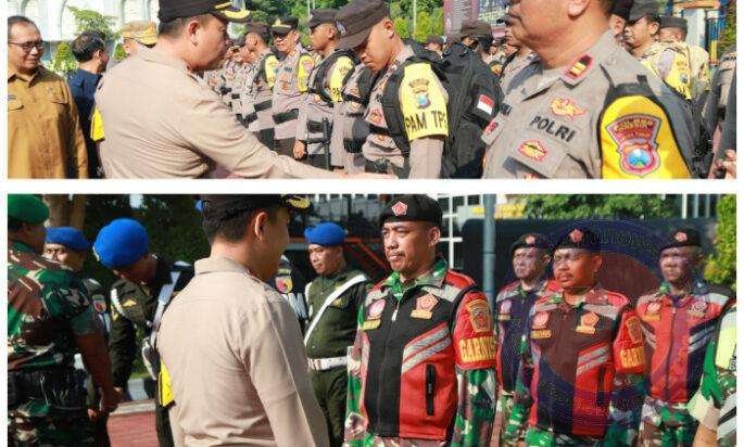 Kapolres Gresik AKBP Adhitya Panji Anom didampingi Dandim 0817 Gresik Letkol Inf Ahmad Saleh Rahanar dan Sekda Kabupaten Gresik Achmad Washil Miftahul Rachman dalam apel di halaman Mapolres Gresik. Selasa (13-02-2024).