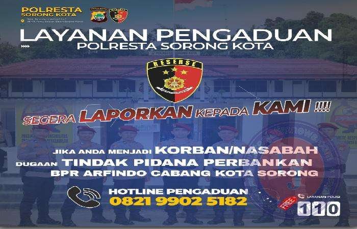 “Kami dari satuan Reskrim Polresta Sorong Kota membuka layanan untuk pengaduan kepada seluruh masyarakat kota Sorong yang merasa menjadi nasabah atau korban dugaan tindak pidana perbankan di bank arfindo cabang Kota Sorong dengan nomor hotline 0821 9902 5182 ” Ujar Kasat Reskrim AKP Arifal Utama S.TK S.IK M.H.