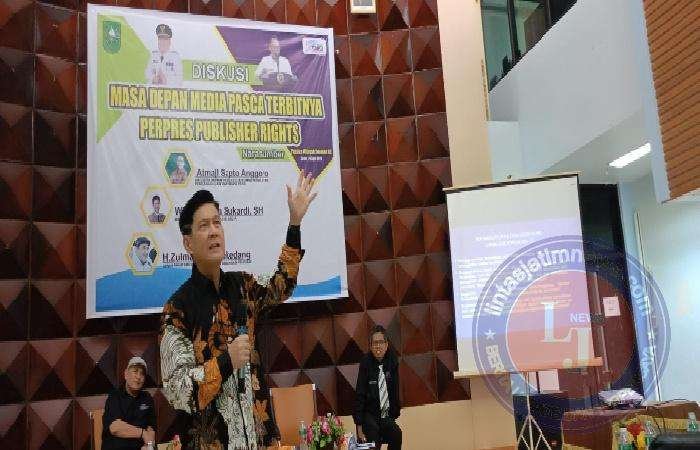 ‘”Saya tegaskan, terbitnya Perpres ini sangat bertentangan dengan Undang-Undang (UU) No 40 Tahun 1999 tentang Pers dan Undang-Undang Nomor 28 Tahun 2014 tentang Hak Cipta serta mengancam kesinambungan kemerdekaan pers,” tegas Wartawan Senior dan Praktisi Pers Wina Armada Sukardi saat memaparkan materi diskusi bertajuk ‘’Masa Depan Media Pasca Terbitnya Perpres Publisher Rights’’ yang digelar Serikat Media Siber Indonesia (SMSI) Provinsi Riaubdi Auditorium H Ismail Suko Pustaka Wilayah Soeman HS Provinsi Riau, Pekanbaru, Senin (29/04/2024).