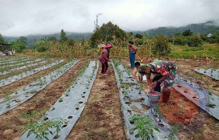 KODIM POSO Pagomex.com – Babinsa Desa Watumaeta, Serda Fadli, Anggota Koramil 1307-10/Lore Utara, melaksanakan kegiatan pendampingan dalam pemupukan untuk meningkatkan ketahanan pangan, khususnya pada tanaman lombok.