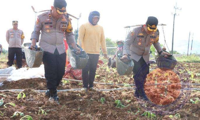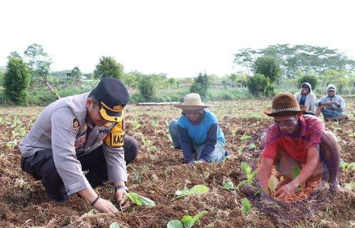 Di Desa Guluk-Guluk Kecamatan Guluk-Guluk, Kapolres Pamekasan bersama jajarannya dan masyarakat setempat bergotong royong menanam tembakau di lahan seluas 1 hektar.