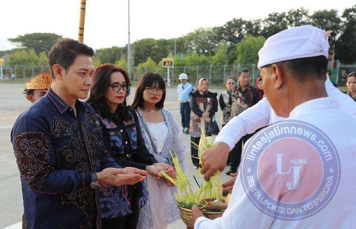 BALIResmi menjabat Sebagai Kapolda Bali, Irjen. Pol. Daniel Adityajaya, S.H., S.IK., M.Si. didampingi Ny. Didit Daniel Adityajaya setibanya di Base Ops Lanud I Gusti Ngurah Rai, langsung disambut dengan prosesi tradisi tepung tawar, Rabu (31/7/2024).