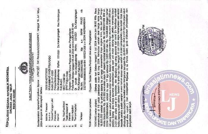 “Dari kejadian tersebut saya mengalami kerugian Rp. 23.604.00,- Dan melaporkan kejadian ini ke Polres Kediri pada tanggal 18 september 2024 sampai sekarang belum ada kejelasan seperti mandek atau berhenti di pihak penyidiknya”, imbuhnya.