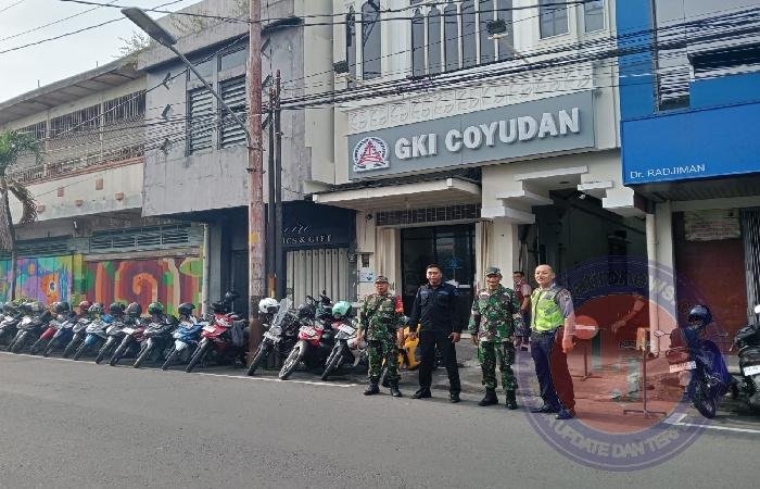 SURAKARTA Pagomex – Babinsa Kelurahan Jayengan Koramil 03 Serengan Kodim 0735 Surakarta, Serka Rohmad bersama piket Koramil 03/Serengan laksanakan pengamanan, guna memberikan keamanan dan kenyamanan dalam menjalankan ibadah Minggu di GKI Coyudan Jayengan Serengan Kota Surakarta, Minggu (16/02/2025) pukul 07.00 WIB.