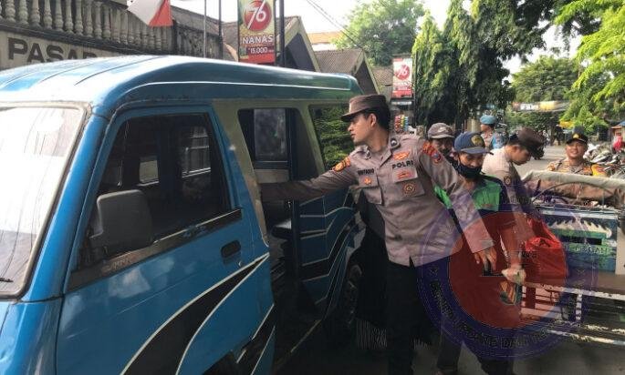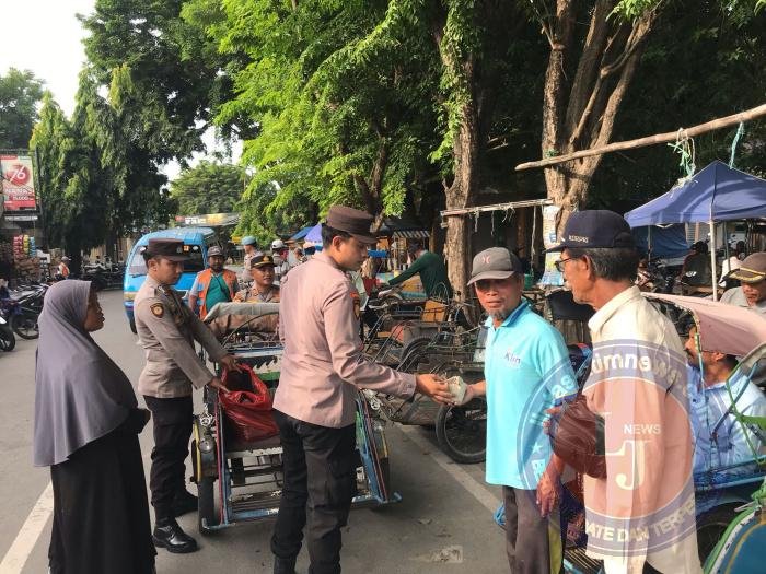 Dengan menggunakan becak, para anggota kepolisian menyusuri jalanan dan membagikan nasi bungkus kepada masyarakat yang ditemui di sekitar Jalan Bhayangkara.