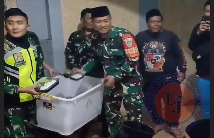 SUMEDANG Pagomex – Dalam semangat berbagi di bulan suci Ramadan, sejumlah prajurit TNI dan Polri dari Koramil 1004 Tanjungsari serta Polsek Tanjungsari, yang dipimpin oleh Kapten Inf Agus Hermawan, kembali menggelar aksi Jum’at Berkah Ramadhan. Berbeda dari kegiatan sebelumnya, kali ini mereka mengadakan Serbuan Sahur, yaitu pembagian makanan sahur kepada jamaah yang tengah melaksanakan tadarusan di Masjid Besar Tanjungsari, Kabupaten Sumedang, pada Jumat (21/3) dini hari sekitar pukul 03.00 WIB.