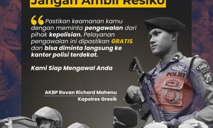 Polres Gresik mengingatkan bahwa masyarakat dapat memanfaatkan layanan pengawalan secara GRATIS, yang tersedia di seluruh kantor polisi terdekat. Layanan ini bisa diminta kapan saja, tanpa dipungut biaya, demi menjamin keamanan warga.