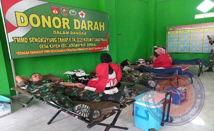 Hari ini Satgas TMMD bersama berbagai pihak menggelar aksi donor darah yang dipusatkan di rumah Bapak Anung Suteja dukuh Bajangan Desa Kayen Kecamatan Kemusi Kabupaten Boyolali. Rabu ( 21/05/25)