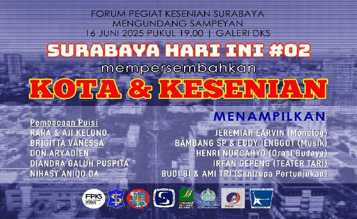 Tema Kota dan Kesenian inilah yang akan diangkat dalam kegiatan FPKS pada 16 Juni 2025, pukul 19.00 – 21.00 di Galeri Dewan Kesenian Surabaya. Dan pada program kali ini, FPKS menyelenggarakan dua kegiatan. Pertama seni pertunjukan, kedua, workshop penulisan kreatif berbasis sastra.