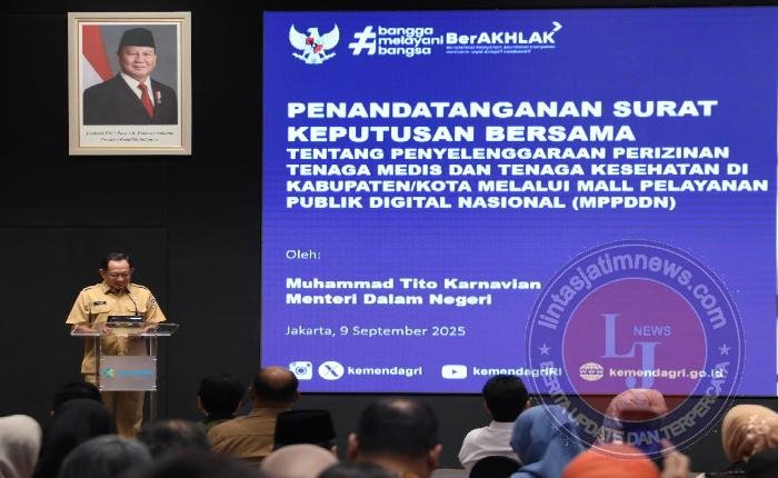 JAKARTA Pagomex – Menteri Dalam Negeri (Mendagri) Muhammad Tito Karnavian menyatakan dukungannya terhadap kebijakan perizinan tenaga medis dan kesehatan melalui Mal Pelayanan Publik Digital Nasional (MPPDN). Hal itu disampaikan Mendagri pada acara Penandatanganan Surat Keputusan Bersama tentang Penyelenggaraan Perizinan Tenaga Medis dan Tenaga Kesehatan di Kabupaten/Kota melalui MPPDN di Gedung Adhyatma, Kementerian Kesehatan (Kemenkes), Jakarta, Selasa (9/9/2025).
