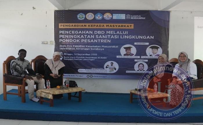 LAMONGAN Pagomex – Sebagai upaya menjaga kesehatan lingkungan serta mencegah penyebaran penyakit Demam Berdarah Dengue (DBD), tim dosen Fakultas Kesehatan Masyarakat (FKM) Universitas Airlangga (UNAIR) menggelar pengabdian masyarakat (pengmas) di Pondok Pesantren Al-Amin, Tunggul, Paciran, Lamongan pada Minggu (14/09/2025).