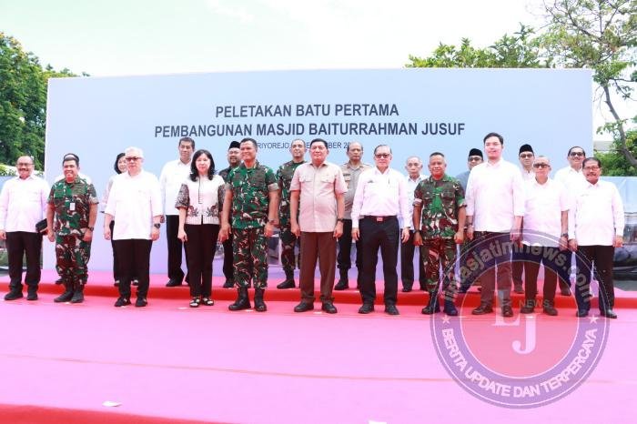 GRESIK Pagomex.com – Menteri Pertahanan (Menhan) Jenderal (HOR) Sjafrie Syamsuddin didampingi jajaran pejabat tinggi TNI dan Polri, termasuk Kapolres Gresik AKBP Rovan Richard Mahenu, menghadiri acara peletakan batu pertama (groundbreaking) pembangunan Masjid Al Yusuf di kawasan (JNM), Desa Bambe, Kecamatan Driyorejo, pada Jumat (19/9/2025).