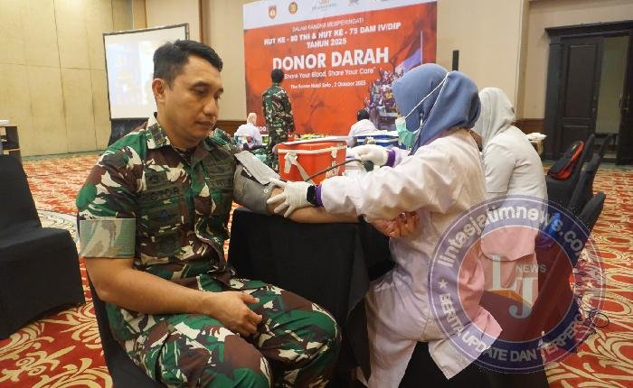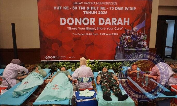 SURAKARTA Pagomex – Dalam rangka menyambut HUT ke – 80 TNI dan HUT ke – 75 Dam IV/Dip Kodim 0735/Surakarta bekerja sama dengan PMI Kota Surakarta dan The Sunan Hotel.menggelar aksi Donor Darah bertempat di Ballroom The Sunan Hotel, Jl. A.Yani no 40 Kelurahan Kerten Kecamatan Laweyan, Kamis (02/10/2025).
